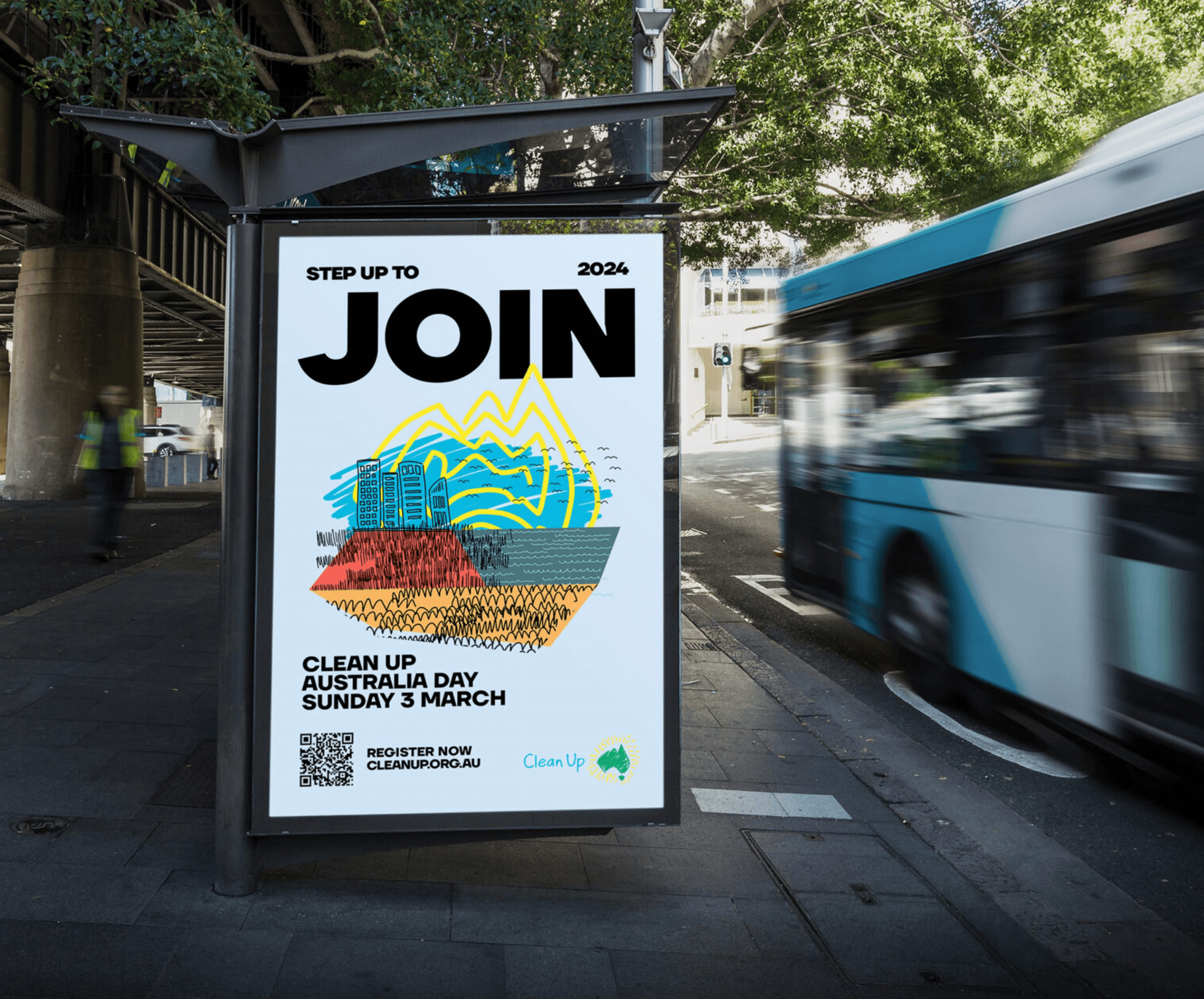 Art direction was expansive. Individual artworks were developed from logo elements, spanning posters, merchandise, event signage, shopping dockets, outdoor and TV spots. All of this was anchored by PR and high-profile events that involved the Prime Minister, members of Cabinet and prominent celebrities. The refresh aimed to transition the perception of Clean Up Australia from “one day of action” to a year-round movement of environmental stewardship, inviting Australians to care for country every day.